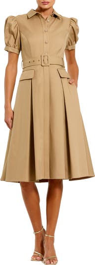 Puff Sleeve Twill Button Up Midi Dress With Belt