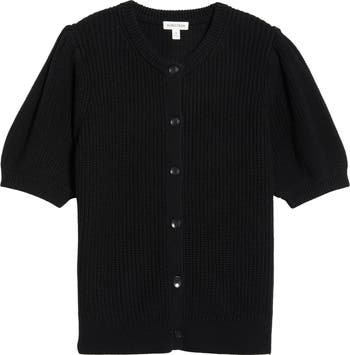 Charming puff sleeves and elbow-length proportions bring quiet structure to this refined cardigan crafted in a rich merino-wool blend that offers cozy warmth.