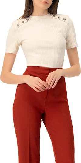 - Ultra stretch beige top made of ribbed fabric, short sleeves, Crew Neckline and button details.