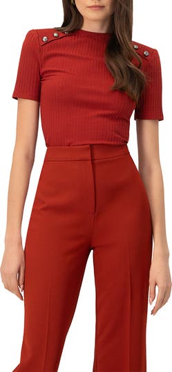 Ultra stretch Chedrón top made of ribbed fabric, short sleeves, Crew Neckline and button details.