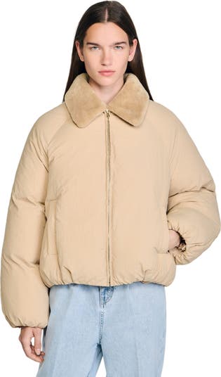 Padded puffer jacket with faux fur collar, raglan sleeves and zip fastening.