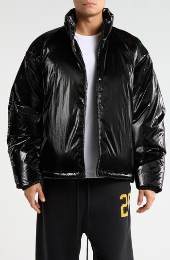 This puffer jacket delivers the brand's signature street-luxury edge in a high-gloss finish. Designed with a relaxed silhouette, it features a stand collar, side pockets and elastic at the cuffs and hem.