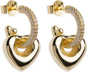 Puffy hearts are suspended from hoops encrusted with glittering cubic zirconia on these sterling silver earrings plated in 18-karat gold.