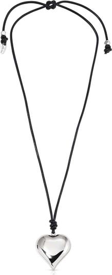 A puffy heart pendant glows in a plating of fine metal on this adjustable cord necklace that's playful and nostalgic.