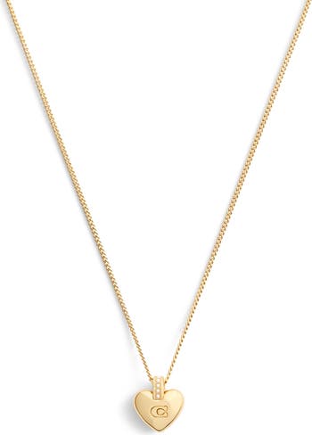 The signature sculpted C brands the heart pendant on this golden necklace given a little extra glow with petite faux pearls.