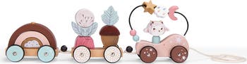 An addition to this beautiful collection "After the Rain", a 2-in-1 early learning toy that can be stacked or pulled along This wooden activity train comprises 1 locomotive and 2 detachable carriages for baby to put together a rainbow, flower, etc., or create their own carriages by stacking the pieces together