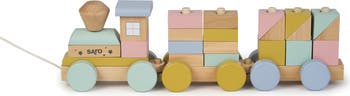 Promote the development of fine motor skills and hand-eye coordination with this wooden building playset of stackable pieces that can be used to construct a pull-style train.