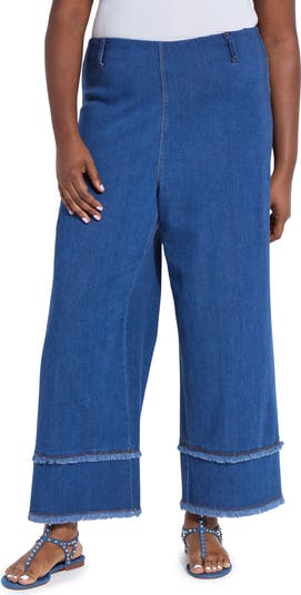 Fringe detail charms the wide legs of these high-waist jeans cut from low-stretch to help keep this style's streamlined silhouetted.