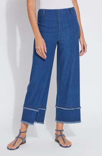 Fringe detail charms the wide legs of these high-waist jeans cut from low-stretch to help keep this style's streamlined silhouetted.