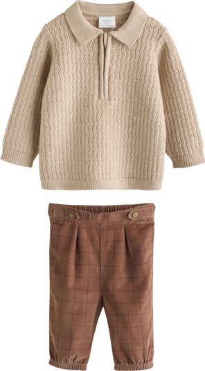 A darling quater-zip sweater is paired with coordinating courdoy pants to create the perfect set for days when they need to look a little fancy.