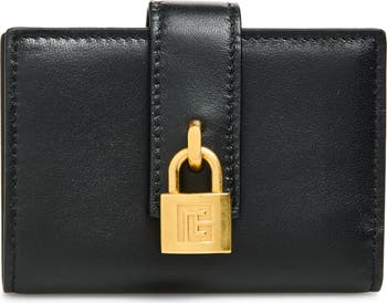 An engraved padlock marks the strap of this Italian-crafted lambskin-leather coin purse that includes two handy card slots.