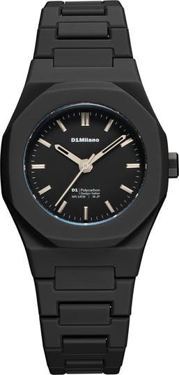 A monochromatic design and clean, matte dial add modern minimalism to a quartz-powered watch shaped from lightweight polycarbonate.