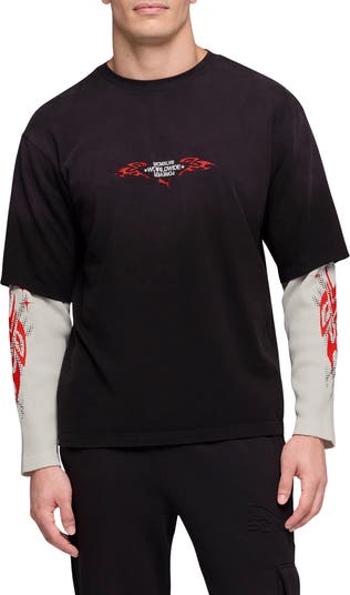 Show off street-savvy style in this boxy, layered T-shirt boasting waffle-knit long sleeves punctuated by sporty logo prints.