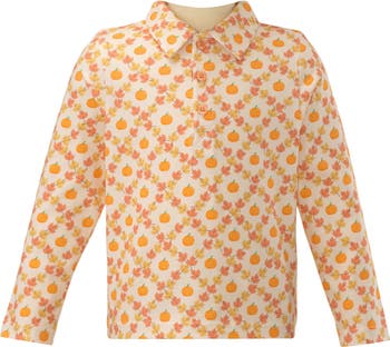 - With a charming pumpkin and leaves print in a check pattern, this long-sleeved polo shirt is perfect for school and transitioning to the new season. Get your little boy ready for fall in this earthy orange and pale yellow top.