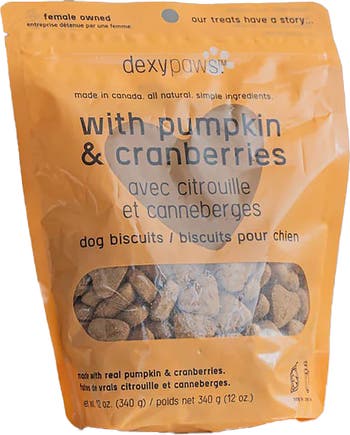 DEXYPAWS: PUMPKIN & CRANBERRY DOG BISCUITS - 12oz Bag - Introducing our treat series. All of our treats are soy- and corn-free and made in Canada with simple, real, and highly palatable food. These treats are perfect to use as a reward during training sessions or whenever you feel like spoiling your pup! They come in a convenient resealable 12oz bag so that your treats stay fresher and crunchier for longer. Gentle on Sensitive Stomachs: With gentle, easily digestible ingredients, these treats are ideal for dogs with sensitive stomachs or dietary sensitivities, providing a soothing and safe option for your pet. INGREDIENT BENEFITS: High in fiber, this helps support digestion and maintain regular bowel movements. It’s also a great source of vitamins A and C, which are essential for immune health and vision. Additionally, the antioxidants present may promote overall well-being. Flavorful and palatable ingredients. INGREDIENTS: Barley, Pumpkin, Cane Molasses, Cranberries, Sunflower Oil, Rolled Oats, Rosemary Extract, Sunflower Lecithin. MADE IN CANADA: Proudly produced in Canada with high-quality ingredients, ensuring you’re giving your dog the best.