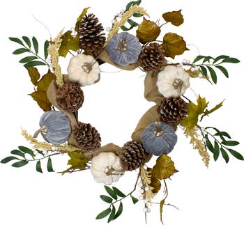 Capture the beauty of the harvest season with this autumn wreath, a stunning piece designed to highlight the warm tones of fall. This Thanksgiving wreath features a beautiful blend of pine cones, berries, velvet pumpkins, rustic burlap, and golden pip berry clusters, creating a textured and realistic design that brings the richness of autumn indoors. The mix of natural-inspired elements offers a vibrant yet rustic style that fits seamlessly with farmhouse, traditional, or contemporary décor. Perfect for Thanksgiving gatherings or simply welcoming the season, this fall wreath makes a statement when displayed on a front door, wall, or above a mantel. The velvet pumpkins provide a soft, luxurious touch, while the golden pip berry clusters and burlap accents introduce earthy tones that balance the crisp white berries. Pinecones tie the entire look together with natural charm, giving the wreath depth and dimension. Durable and reusable year after year, this wreath is crafted from artificial materials that maintain their beauty without shedding or fading. Whether used indoors or outdoors under a covered entryway, this harvest wreath is a timeless decoration that captures the warmth, texture, and abundance of the season. Product Features: Velvet mini pumpkins, foliage, and pine cones Each mini pumpkin is wrapped in a smooth, velvety fabric and is decorated with a gold stem Decorated with white berries and butter yellow mini pip berry clusters Burlap-wrapped grapevine twig backing for easy hanging Recommended for indoor use - if using outdoors, place under a covered area No assembly required – wreath comes in 1 piece Dimensions: 24" diameter (measured from outermost tip/edge to outermost tip/edge across the wreath) Material(s): velvet/polyester/wire/foam/plastic