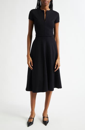 A defined waist gives a fit-and-flare silhouette to this stretchy cocktail dress made with clean, sophisticated lines.