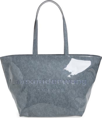 Raised logo lettering adds an unmistakable signature to this statement tote designed in an ultraroomy silhouette from denim that has a liquid-look sheen thanks to a lacquered coating.