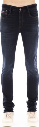 Signature details bring big brand energy to these superskinny jeans cut from stretch denim in a dark wash.