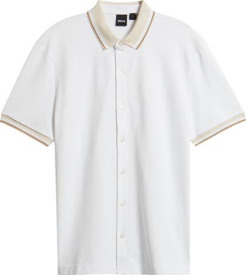 Sharp contrast tipping and a clean placket define a classic button-up cut from breathable cotton that's cool, comfortable and always a smart option.