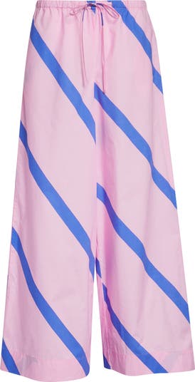 Diagonal stripes energize these wide-leg cotton pants designed for comfort and directional style. The relaxed fit and elastic drawstring waist make them easy to wear, while side-seam pockets and back patch pockets add practical detail. Printed in Helsinki, the graphic pattern gives the laid-back silhouette a distinctive, artful finish.