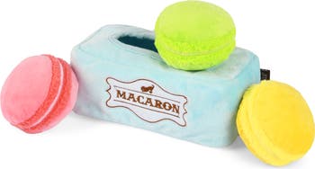 P.L.A.Y. PUP CUP CAFE MUTT-A-RONS - The ultimate treat for your pup's playtime adventures! This charming box of colorful macarons is designed to bring joy to your furry friend with three squeaky delights nestled in a crinkly blue box. Whether your pup prefers solo play or shared fun with a playmate, this find-n-seek toy is perfect for keeping the excitement and playfulness going. Hide cookies inside and watch as your pup savors each squeaky bite, turning playtime into a delightful treat-filled adventure they'll love! Spoil your pup's taste buds and indulge their playful instincts with P.L.A.Y.'s Pup Cup Café Mutt-a-rons – the irresistible toy that promises hours of fun and excitement! STRICT QUALITY STANDARDS: All of our toys meet the same strict quality standards for manufacturing infant and children products. Meet requirements for EN71 – Part 1, 2, 3 & 9 (EU), ASTM F963 (US) toy safety standards and REACH - SVHC.