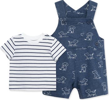 Baby will be ready for their next day out in this mix-and-match set that pairs a striped cotton T-shirt with coordinating overalls patterned with adorable puppies.