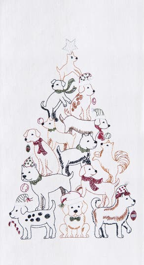 No home is complete without a lovable furry friend to share it with, and no kitchen is complete without this adorable Puppy Tree Flour Sack Towel. Featuring a tree of puppies dressed for the holidays, this embroidered flour sack towel is the perfect gift for the dog lover on your Christmas list. This kitchen towel is perfect for hostess gifts, housewarmings, teachers, or for anyone on your holiday list. Crafted of 100% cotton and machine washable. Towel measures: 18 inches x 27 inches.