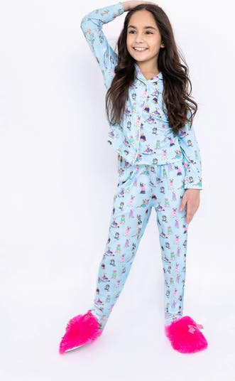 A silky soft puppy printed jersey loungewear set featuring a long sleeve button-up top and matching pants with elastic waist.