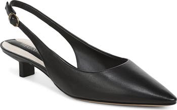 A pointy toe furthers the streamlined profile of a slingback pump set on a demi kitten heel for a subtle whisper of height.