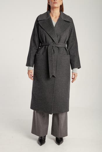 Sumptuous cashmere longline wrap coat, drapes beautifully into a sculpted silhouette, belted waist for warm sophisticated layering.