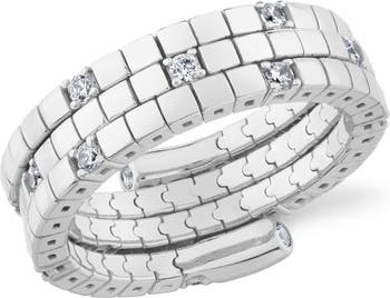 Round cubic zirconia bring icy bits of sparkle to this flexible, three-row ring that winds and winds around your finger.