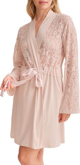 Lace trim accents the supersoft knit skirt of this short robe that accompanies you comfortable from your morning coffee on the terrace to an evening lounging on the sofa.