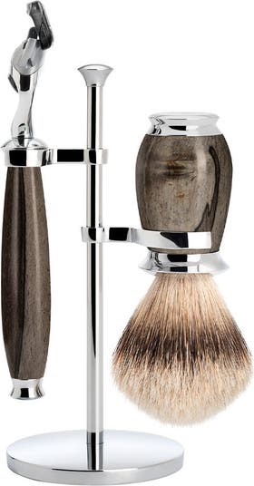 Razor Head Gillette Fusion Gentle, safe and reliable. The five superimposed blades of Gillette Fusion enable a careful and thorough shave that is also gentle on the skin. A precision edging blade ensures precise contours, while comfort lubrication strips guarantee an even smoother result. Thanks to its simple and safe handling, this system is ideal for newcomers and replacement blade cartridges are available from major retailers. Also compatible with SkinGuard, Gillette’s latest product development. As a Gillette Trusted Partner, MÜHLE only uses Gillette Genuine Parts. Brush Head Silvertip Badger A tried and trusted classic and the undisputed leader of the natural hair range: silvertip badger is particularly soft and flexible and is exclusively handmade at MÜHLE. Its silver sheen and a black band around each individual hair are distinguishing features. Its fine, conically shaped hair absorbs a lot of water and guarantees a dense, creamy lather. The Material Grained Beech. Exceptional in colouring, varied in structure. Through targeted “stocking”, the beech wood develops an accentuated and contrasting grain. Dyed in elegant shades of grey and soaked in precious resin, the high-gloss surface of the handles allows water and soap foam to roll off. Properties Ring size: M- 21mm Bowl included: No Shaving brush head: Silvertip Badger Hair Vegan: No