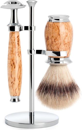 3-part shaving set without bowl, handles of karelian masur birch with chromed metal accents: Shaving brush with Silvertip Fiber Shaving brush size M = medium shaving brush head with 21 mm ring to screw off Safety razor, compatible with classic razor blades Stand made of metal, chrome-plated The Material - Karelian masur birch Due to the harsh climatic conditions, the growth height of the masur birch is low and the wood develops an exceptionally rich grain. The precious wood has therefore been traditionally worked to create decorative objects. The hand-picked square timbers are shaped by turning. Only the finest specimens are processed further and stabilised and coated in a special procedure. This makes the wood water resistant and hard-wearing. The high-gloss surface very expressively accentuates the individual veining of the grain. The Brushhead - Silvertip Fiber We offer a synthetically produced premium quality whose material characteristics are analogous to those of the precious natural hair, silvertip badger. 'Silvertip Fiber' is very soft at its fine tips, but somewhat more stable than natural hair in the middle section. These characteristics produce a pleasant, soft sensation on the skin when the lather is applied, without having to forgo the desired firmness of the hairs in the lathering process. In daily use, the manually processed Fibers are less sensitive than natural hair as they dry more quickly and are resistant to shaving soaps and creams. The completely vegan Fibers are also somewhat easier to use than natural hair as they produce a particularly creamy and thick lather from a small amount of shaving soap or cream, which is used much more sparingly as a result. The Razorhead - Classic razor blade For generations, the safety razor has been regarded as a stylish classic which can even shave edges with precision. Even if the open blade does demand a little respect at first: After a brief familiarisation period, and guided by a steady hand, it produces a very close shave and a lasting result. Unlike modern blade systems, the head of the safety razor does not move. The blades are replaced by unscrewing the cap. They can be purchased from us and by retailers everywhere. We recommend our rust-proof MÜHLE razor blades which are the perfect match for our safety razors. Measures: Dimensions: 100 mm x 141 mm Weight: 370 g We recommend our rust-proof MÜHLE razor blades which are the perfect match for our safety razors.