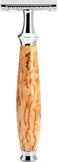 As part of our Classic Range, PURIST concentrates on the art of the essential; dispensing of all that is superfluous. This series is characterized by its gently rounded handles and a broadly shaped neck. The Material: One of the most distinctive and rare materials, Karelian Masur Birch is grown in a small area of Karelia during mid-winter season. Harvested only when the ground is frozen, the harsh climatic conditions result in the low growth height of the Masur Birch which, in turn, produces the wood's characteristically rich grain. Once picked, the square timbers are then shaped by turning. Only the finest quality Masur Birch is then further processed and stabilized during a special procedure. This procedure ensures the wood becomes hard-wearing and water resistant. The use of natural material ensures that each product is unique, the handle's graining adding individual character to each brush, razor and set. The Razor: A real investment piece, the R55SR supersedes the need for single-use plastic. Growing concern in the effects of disposable plastic makes the R55SR a great choice for the environmentally conscious, reducing both unnecessary plastic waste and unwelcome environmental impacts, without compromising on precision. Blades are easily replaced by unscrewing the head of the Safety Razor. Replacement blades can be purchased from us, we recommend the rust-proof MÜHLE razor blades, a perfect match for this timeless razor. Measurements: Dimensions: 42 mm x 120 mm Weight: 72 g