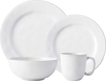 An attractive dinner set crafted from whitewashed ceramic features delicately worn edging, giving it the look of antique ware one might find in the French countryside.