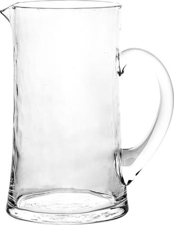 Enjoy batch cocktails, mocktails or your favorite morning juice with a mouthblown glass pitcher showcasing a dappled texture.