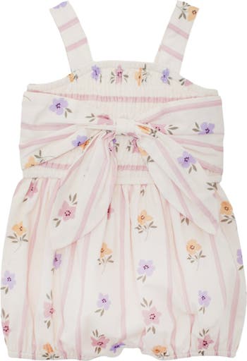 This pastel floral cotton woven romper features a smocked bodice with a decorative front bow.Fabric Care & Content Machine Wash Cold | Line Dry | Do Not Bleach 100% Cotton Denier lining
