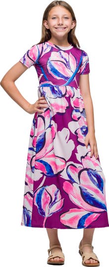 Vibrant and full of movement this 24sevenKid Girls maxi dress by 24sevenkid features a bold watercolor floral print in purple pink and blue tones. The short sleeves and empire waist create a flattering fit while the maxi length adds an elegant touch. Ideal for both casual wear and dressier events this colorful dress pairs effortlessly with flats or sandals for an easy complete look.