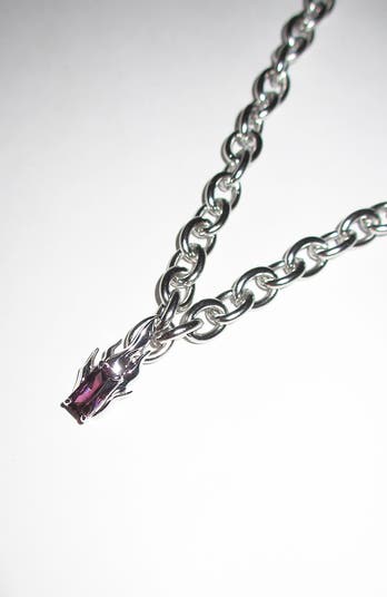 This unique piece features a purple flame pendant in 925 sterling silver on a stainless steel cable chain. Wear it as a standalone statement or layered with other chain