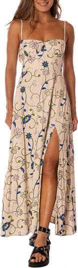 Intricate embroidery blossoms all over this linen-and-cotton-kissed cover-up dress featuring a lace-up back and a soaring slit.