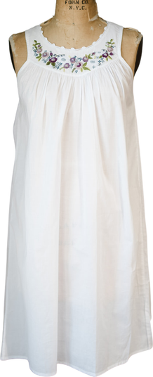 Our Rosebud design is exquisite artistry. The intricate detail on the bodice is a mix of raised French knots, looped knots and about five other embroidery stitches. These nightgowns are one of our finest creations, made of the softest white 100% cotton batiste. Our Purple Rosebud nightgowns have ample arm room and two choices of hem for ultimate comfort: Midi length: hits just below the knee to mid-calf Knee Length: hits at or just above the knee Key Features: -Hand embroidered design on 100% White Cotton Batiste -Fair Trade Verified -Inclusive sizing from Petite to XXL -Made in Haiti by our Artisan Cooperative