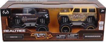 - 2 TRUCKS IN 1 PACKAGE: A pair of realistic Ford trucks with RealTree camo graphics! The RealTree Ford F-150 & Jeep Wrangler Unlimited are 1:24 scale, friction-powered trucks for an authentic off-road experience.