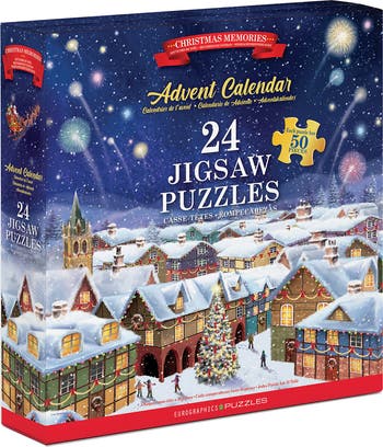 EUROGRAPHICS: CHRISTMAS MEMORIES JIGSAW PUZZLE ADVENT CALENDAR. This enchanting advent calendar features 24 unique holiday-themed puzzles, offering a delightful daily countdown to Christmas. With a total of 1200 pieces, each of the 24 individual puzzles consists of 50 pieces, allowing you to create a new 5" x 5" festive scene every day. Packaged in a high-quality book-style box, this advent calendar doubles as a charming display piece, adding to the festive decor of your home. The back of the box showcases previews of all 24 puzzle images, while inside each day’s compartment, you'll find the puzzle pieces neatly stored in re-sealable plastic bags. The overall product size is 14.5" x 14.5" x 3.25", making it a convenient and eye-catching addition to your holiday celebrations. Manufactured with premium European blueboard, these puzzles ensure durability and a superior fit, making them perfect for repeated use. The re-sealable bags allow you to safely store each puzzle, so you can enjoy all 24 puzzles again each year, or even exchange them with friends and family, spreading the holiday cheer far and wide. Unwrap the joy of Christmas with the Eurographics: Christmas Memories Jigsaw Puzzle Advent Calendar. Perfect for puzzle enthusiasts and families, this advent calendar brings an element of surprise and excitement to the holiday season. Start a new holiday tradition with this engaging and sustainable countdown gift, and make every day leading up to Christmas a special part of your festive adventure!