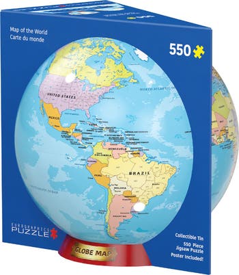 EUROGRAPHICS: WORLD MAP SHAPED TIN - 550 PIECE JIGSAW PUZZLE. Dive into a world of exploration and discovery with the Eurographics World Map Shaped Tin 550 Piece Jigsaw Puzzle! Encased in a round, globe-shaped tin measuring 8" x 9" x 8.5", this puzzle set features an intricate map of the world, offering both a challenging and educational experience. Once completed, the puzzle forms a captivating 13" x 19" image, perfect for display on your family table, coffee table, or wall. Crafted with care from premium, 100% recycled European blue board and printed with eco-friendly, non-toxic vegetable-based inks, this puzzle is not only entertaining but also environmentally conscious. Whether you're a casual solver looking to unwind or a puzzle enthusiast seeking a stimulating challenge, the 550-piece format ensures hours of enjoyment and learning. The World Map tin isn't just for storage—it's a decorative piece in its own right, adorned with beautiful map graphics that evoke a sense of wanderlust and nostalgia. Complete with a folded poster of the puzzle image, this set makes a thoughtful gift for geography buffs and puzzle lovers alike. Whether you're exploring continents piece by piece or planning your next adventure, the Eurographics World Map puzzle promises to bring the world into your home in a unique and engaging way. Get ready to piece together continents, oceans, and landmarks, and embark on a journey of puzzling excitement!