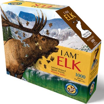 Madd Capp’s 1000-piece I AM ELK has a unique, animal-shaped border! No square corners, no straight edges… just a little extra challenge and a lot more fun (a few days, depending on your skill level). To bring the elk to life, Madd Capp puzzlers typically build from the inside out, rather than the outside in. The finished puzzle is poster-sized (40” x 35”) and – with a semi-gloss, photo-realistic image – pretty impressive looking! Included with each puzzle is an “extra” – an educational Fun Facts booklet. On one side is all kinds of interesting info about the animal you’re puzzling. On the flipside is a full puzzle image to use as a reference or hang as a poster. Packaged securely in Madd Capp’s signature five-sided box, puzzles are designed to be displayed on a shelf, just like books in a library. For ages 12 and up
