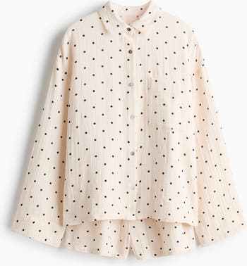 Pyjamas with a shirt and pair of shorts in soft cotton muslin. Long-sleeved shirt with a collar, buttons down the front and a patch chest pocket. Shorts with an elasticated, drawstring waist.