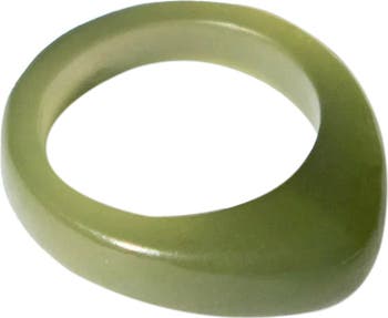 A teardrop shaped ring in green nephrite. Natural and untreated nephrite made by handwork of carving and polishing. Because of the gemstone’s natural characteristics, each piece may vary slightly in colors and textures.