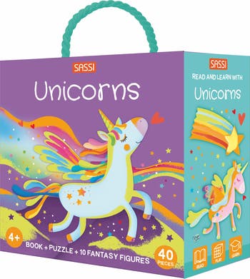 - VISUALLY STUNNING STORAGE BOX: Presented in a beautifully adorned box with shimmering iridescent details, this set is both visually appealing and easy to store after playtime. Book + Puzzle + Unicorns!